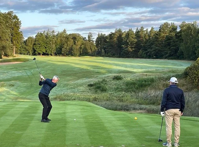 In a ‘the butler did it’ spoiler big Alan Black teed off first at 7 am and won the event with 39 points, including 2s on 13 and incredibly 17. You will all know actuaries, even when acting as assistant golf reporter, can foretell the future and it so happens I captured a picture of Alan on the first tee (above) at the top of his backswing! David Logie will give a written critique of the position at another time.