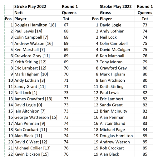 Round one of our Stroke Play Championship was played this morning in glorious spring sunshine on the Queens course. Bumpy conditions and a stiff easterly wind made it tricky with the back 9 playing as long and difficult as I have ever seen it! A record field of 41 meant an early start for some and the first group out at 7.20am set the early target with nett par from Colin Campbell and one over from Andrew Watson. The third group featured two of our form players in Iain Aitchison and Eric Lambert. Iain was 4 under after 4 but Eric obviously managed to talk him off his game and they both finished over par. Paul Lewis put in another decent performance with a nett par round and I was one worse a few groups further back. Also worth a mention was Allister Wallace who was unfortunate to lose a ball at the 8th (NR) but came back in an amazing nett 29 (including another lost ball). Playing toward the end of the field Keith Stirling, Douglas Hamilton and Crawford Gray were looking promising with Keith also sitting at 4 under at one point. Crawford held on to finish at one over, Keith faltered but still managed a creditable one over and Queens specialist Douglas finished with two great pars to take the first round lead with the only under par round of the day. In the scratch section the scores definitely showed how tough the course was playing with no-one getting close to par. The best was a 73 from David Logie, followed by 74’s from Andy Lothian and Neil Lock. Leading scores are below and all scores can be seen on the app. Round two will be on the PGA on July 2nd with Round three on the Kings on September 10th