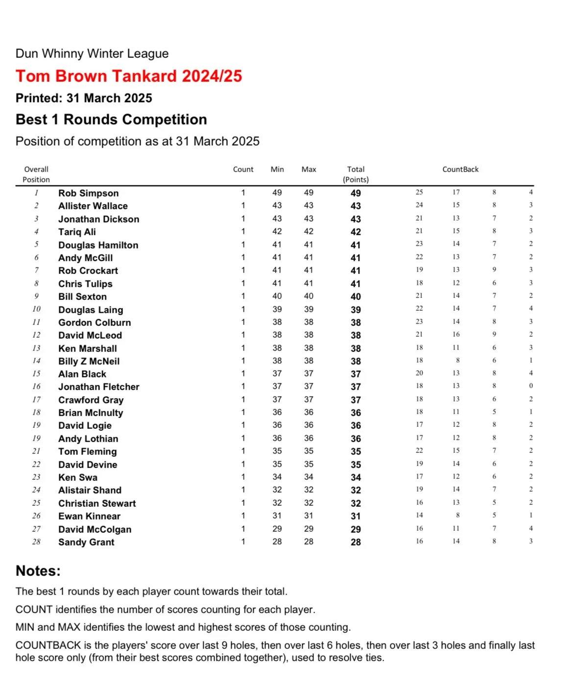 In the Best 4 scores for the Winter Strokeplay Trophy only three points separated the top three with Douglas Hamilton winning with four terrific cards from only nine submitted to beat Chris Tulips and Allister Wallace. Congratulations Douglas terrific scores on all three courses.