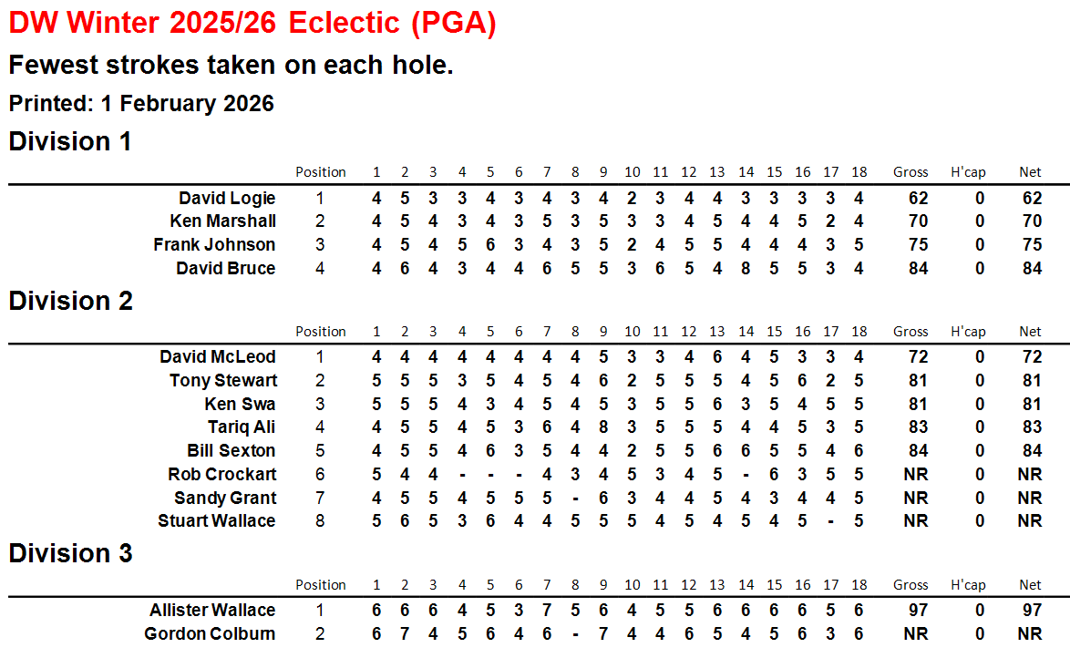 With the King’s course now officially tucked in for its winter hibernation, the first chapter of our Eclectic saga has closed. A massive congratulations to David Logie, whose staggering 56 proved that he wasn't just playing the same game as the rest of us—he was playing a much easier version of it. Hats off also to Rob Crockart and Allister Wallace, who both put in stellar shifts to keep the leaderboard looking respectable.