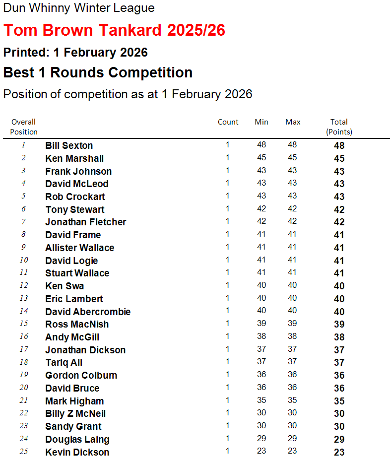 In the race for the Tom Brown Tankard, Bill Sexton has vaulted to the summit with a formidable 48 points. However, he shouldn't get too comfortable in the winner's enclosure just yet; Ken Marshall is currently breathing down his neck with such intensity that Bill might need to check for singe marks on his collar.