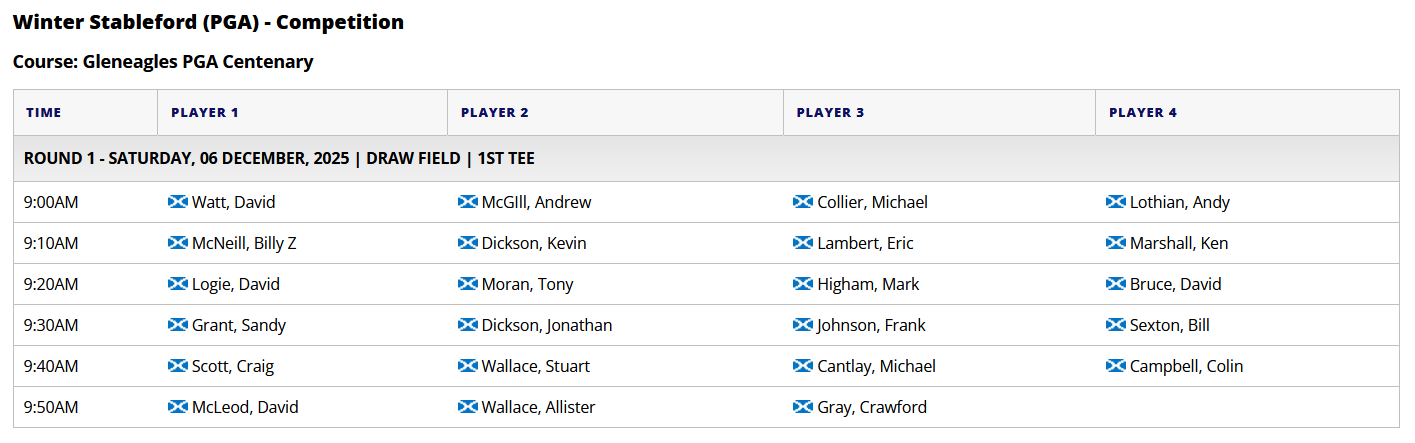 Draw- Winter Stableford. PGA. Sat 6th Dec.