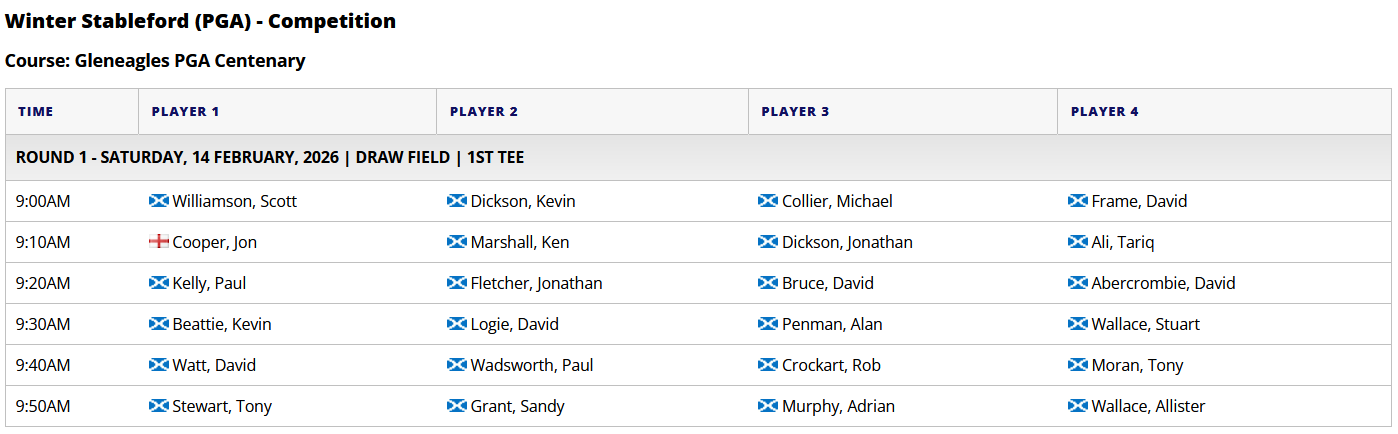 Draw - Winter Stableford. PGA. Sat 14th Feb 2026. 10 Feb Written By Tariq Ali Draw for this weekend is below. Yes, we are on PGA this time!Waiting list -Billy Z McNeil Tariq Ali