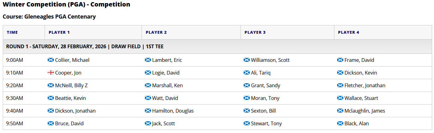 Draw- Winter Stableford. PGA. Sat 28th Feb 2026. 24 Feb Written By Tariq Ali Draw is below. The following are those on the wait list -Frank Johnson Tariq Ali