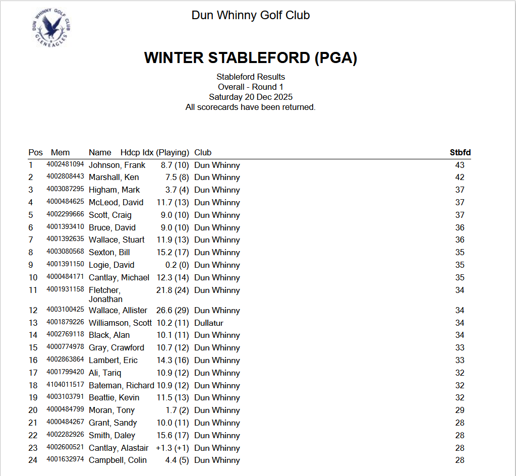 Result - Winter Stableford. PGA. Sat20th Dec.