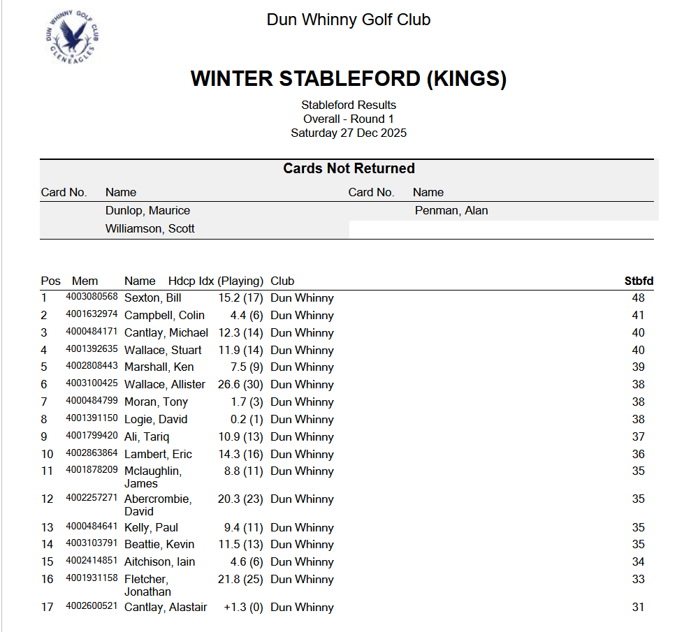A sparkling winter’s day greeted competitors for the Winter Stableford on the Kings course at Dun Whinny – once the frost delay finally loosened its hold on the first tee. The sunshine may have been gentle, but the scoring that followed was anything but.